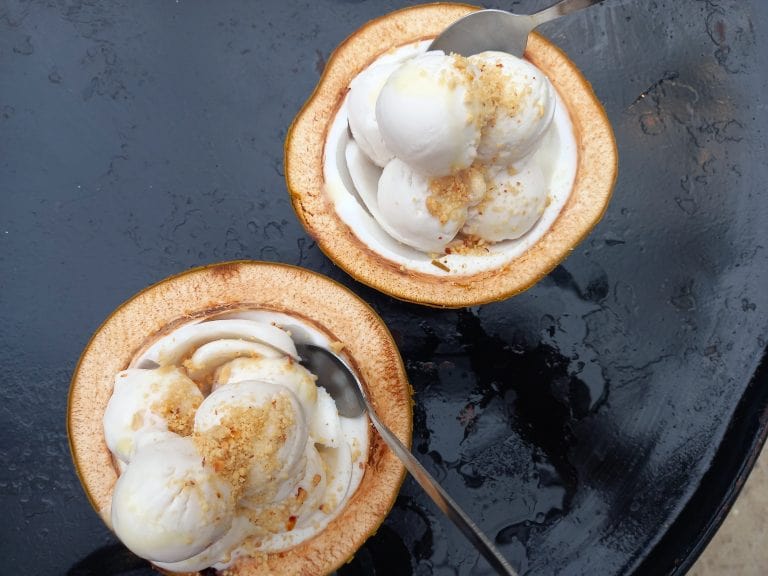 Kem Dừa (Coconut Ice Cream): Dừa Đất [MAP] | CocoDeli [MAP]: Along with several other coastal destinations in Vietnam, kem dừa (coconut ice cream) is a trend among domestic travellers. Real coconut ice cream is a time- and labour-intensive process resulting in fresh, silky, refreshing and delicious ice cream. The proliferation of kem dừa establishments on Côn Sơn Island in the last few years is incredible. Two of the most famous and popular are Dừa Đất (regarded by most people in the know as the best on the island) and CocoDeli (the ice cream might not be quite as good but the setting is nice). The coconut ice cream is presented in a coconut shell with toasted coconut on top and a glass of fresh coconut water on the side, as well as many, many other optional accoutrements. It’s great fun and perfect for a mid-afternoon treat on a hot, sunny day.