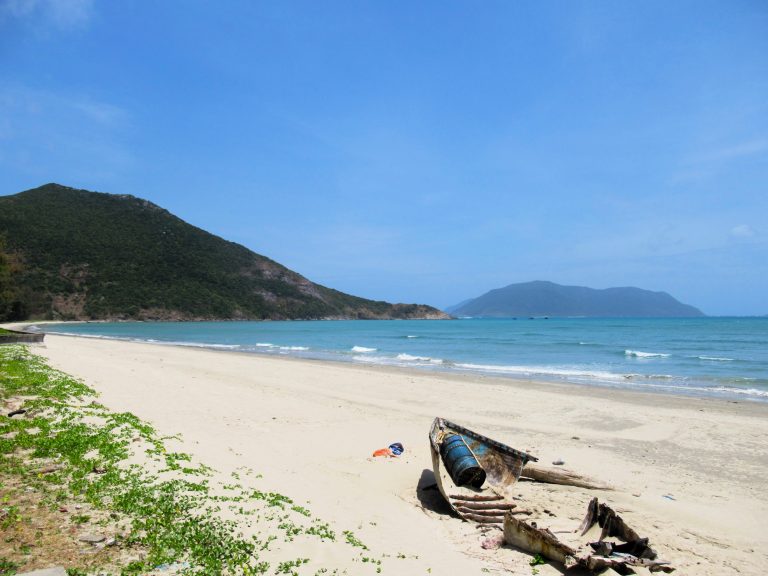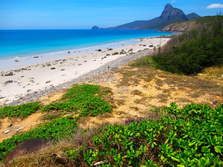 Nhát Beach [MAP]: Stretching for several kilometres along the southern coastline, Nhát Beach is one of the most dramatic and striking in Vietnam. The view of the bay from Mũi Cá Mập (Shark Cape) is like something out of Jurassic Park: the road cutting along the coast below the barren, windswept southern slopes of Núi Thánh Giá – the highest mountain on the Island – with big boulders strewn on the side of the asphalt, decreasing in size as they roll down to meet the rice-white sand and gin-clear water, and, in the distance, the rugged island of Hòn Bà looming like a perched bird of prey. The swimming is excellent, especially before noon, when the water is often calm and the tide is usually out, thus exposing more of the beach. However, there’s hardly any shade on Nhát Beach, and it’s increasingly difficult to ignore the ever-expanding landfill on the opposite side of the road: yet another reminder of how fragile this island is.