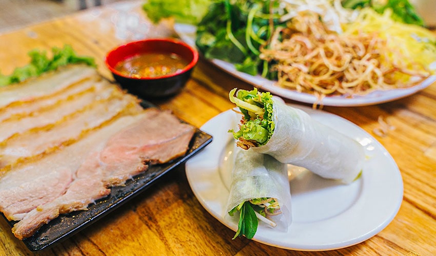 This dish is unforgettable for its perfect harmony: thin slices of boiled pork belly with both lean and fat, fresh herbs, soft rice paper, and the star of the show – that “divine” anchovy dipping sauce (mam nem). Every roll is like tasting the essence of Da Nang – rich, balanced, and deeply satisfying.