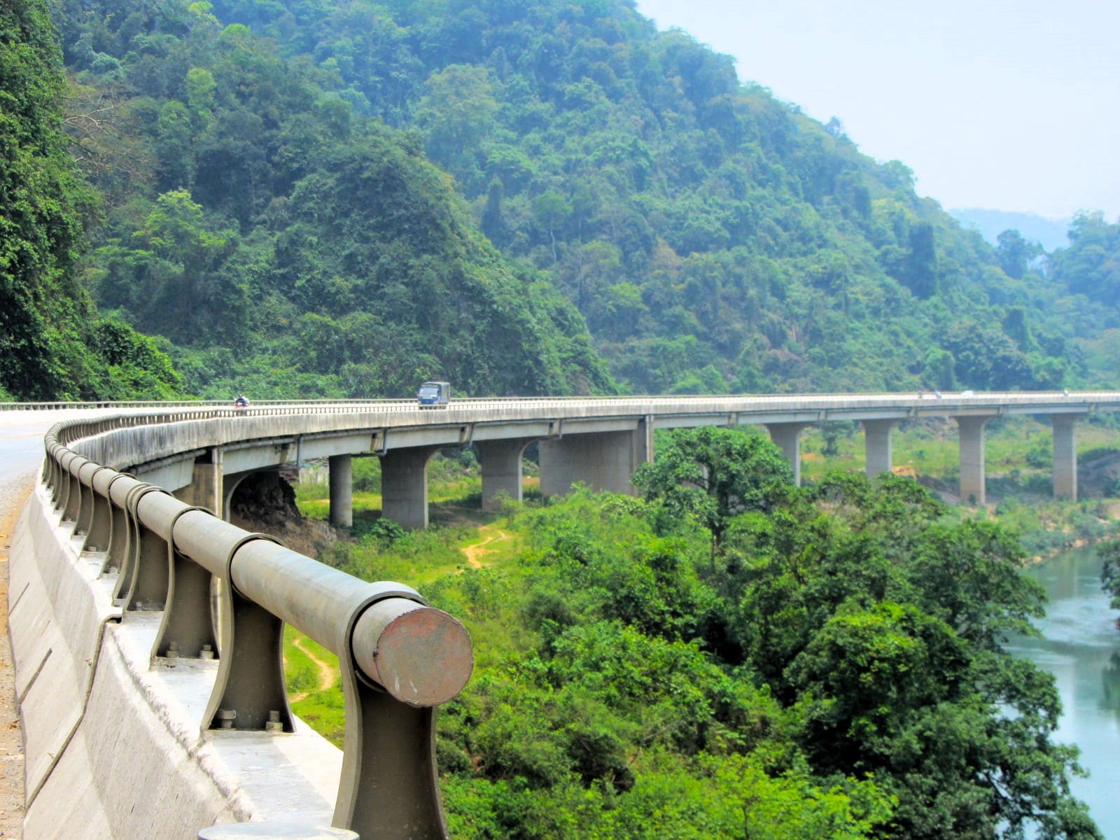 After Tân Ấp, the scenery becomes much gentler: the valleys are wide and cultivated, the road is straight, the mountains recede into the distance and traffic gets heavier thanks to trucks plying between Lao border gates in the west. Trade with Laos is booming and this means that transportation corridors linking the two communist nations are blighted by freighters crawling along the roads. Still, the riding is pleasant and swift, road conditions are good and the landscape is big and green if not spectacular. Hương Khê is a surprisingly lively settlement with a large lake and some decent food and accommodation if needed.