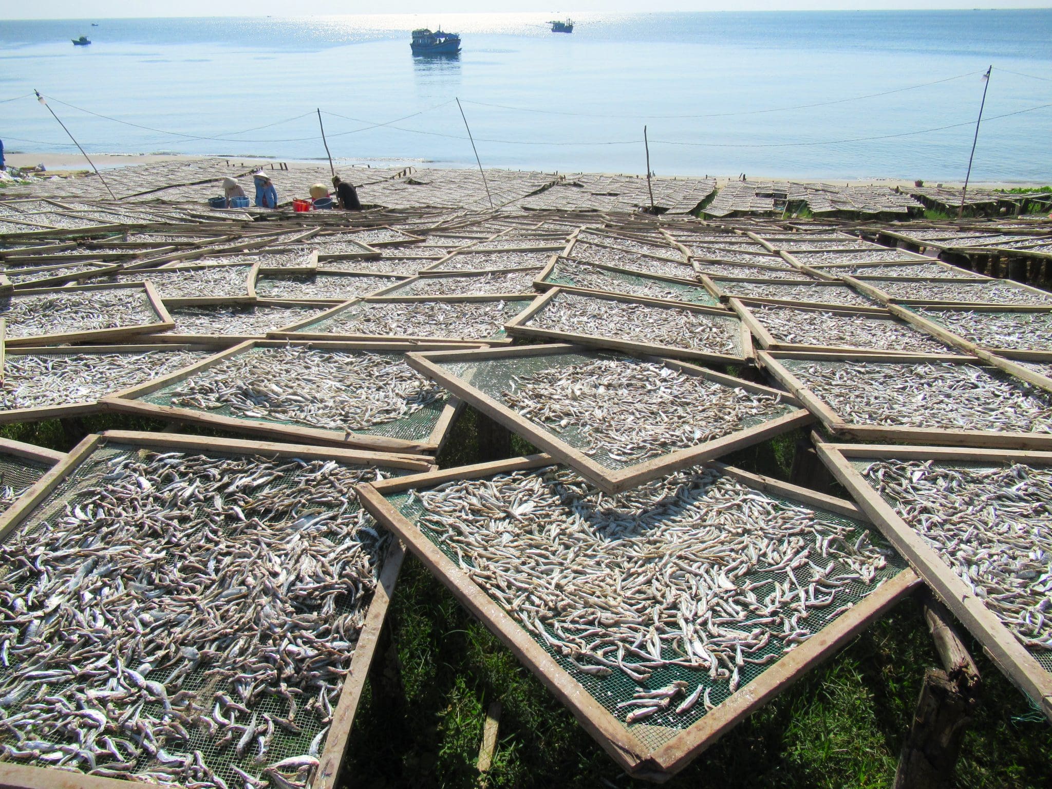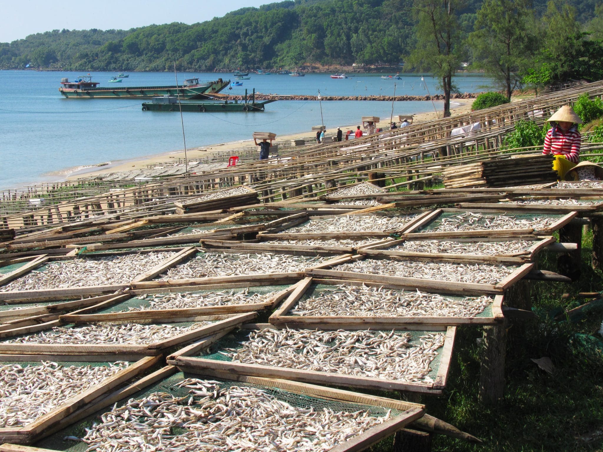 Description: Accessed via a bumpy dirt road from the south or the north, Đất Đỏ Beach is a pretty bay bookended by two small headlands that frame an attractive stretch of sand and calm waters in the south-west of the island. The bay is nice enough (although the surroundings are quite scruffy) and there are a handful of very good local seafood restaurants (try Quán Ngọc Đông) right on the sand at the northern end of the beach. The swimming is pretty good if you want to work up an appetite before a seafood feast. But the beach’s primary focus is the production of cá cơm khô – dried anchovies – which are laid out to dry in their hundreds of thousands on wooden trestles on the sloping beach to be used in the production of the island’s famous fish sauce. It’s quite a sight. There’s no development on Đất Đỏ Beach yet: it is still a working beach, rather than a leisure beach. At the moment, there’s no accommodation here, but there’s lots of rooms to the south at the gigantic, hideous Sun Group resort-theme park-cable car monstrosity.