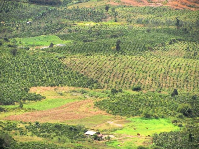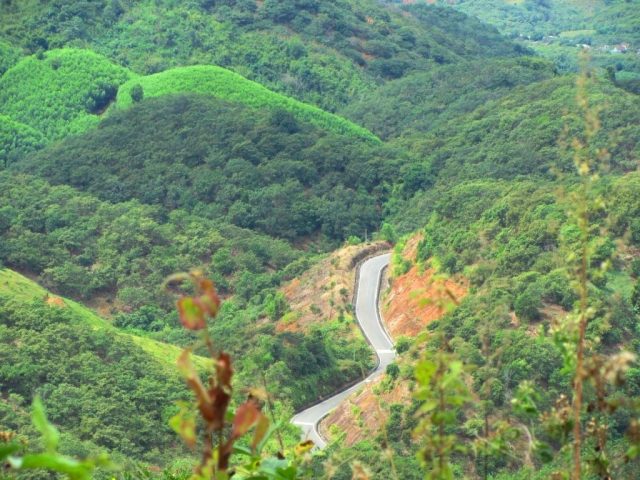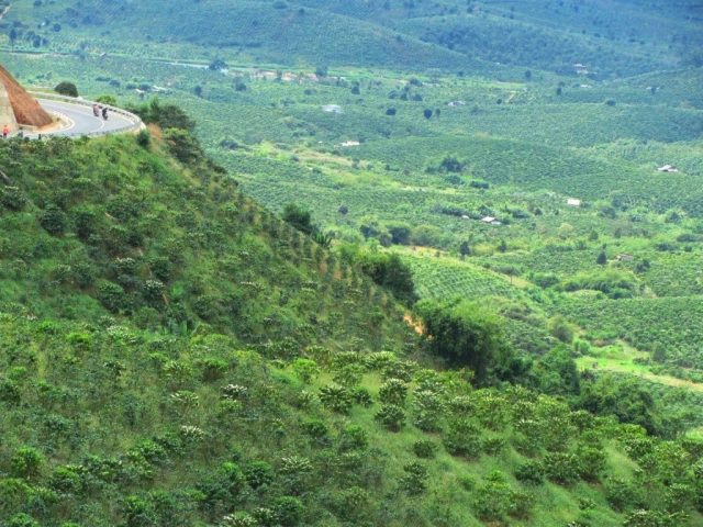 The first section of this road (unnamed, once again) is superb. There are several reasons for this, but first among them is the sheer riding pleasure. The asphalt is newly laid; treacle black and perfectly smooth. It’s essentially a motorcycle course in the mountains: a blend of long straights, hairpin bends, and meandering chicanes. The scenery is big: impressive for its scale and scope, if not for its natural beauty. Coffee bushes dominate the scene: it’s easy to see how Vietnam has become, in just over a generation, the second largest producer and exporter of coffee in the world. The road snakes off into the distance, up and down mountains, through valleys, bisecting the endless coffee plantations that appear to stretch westwards all the way to the Cambodian border. The tarmac bends and curls, and climbs and descends over the big, barren landscape, like a gigantic, black serpent, wriggling across the Central Highlands. After a while, the new road ends and the condition of the second half of the route, up to the junction with QL27 at Lam Ha, is only OK, so watch out for some potholes.