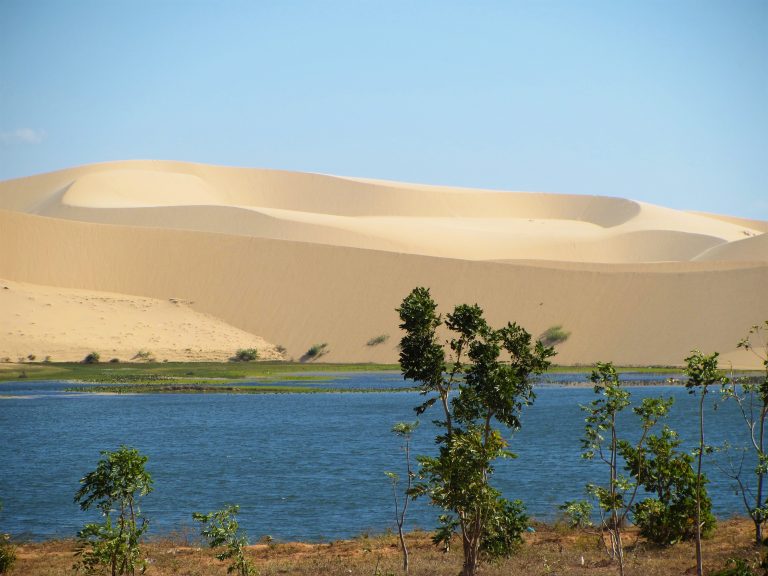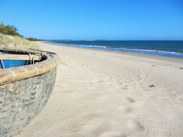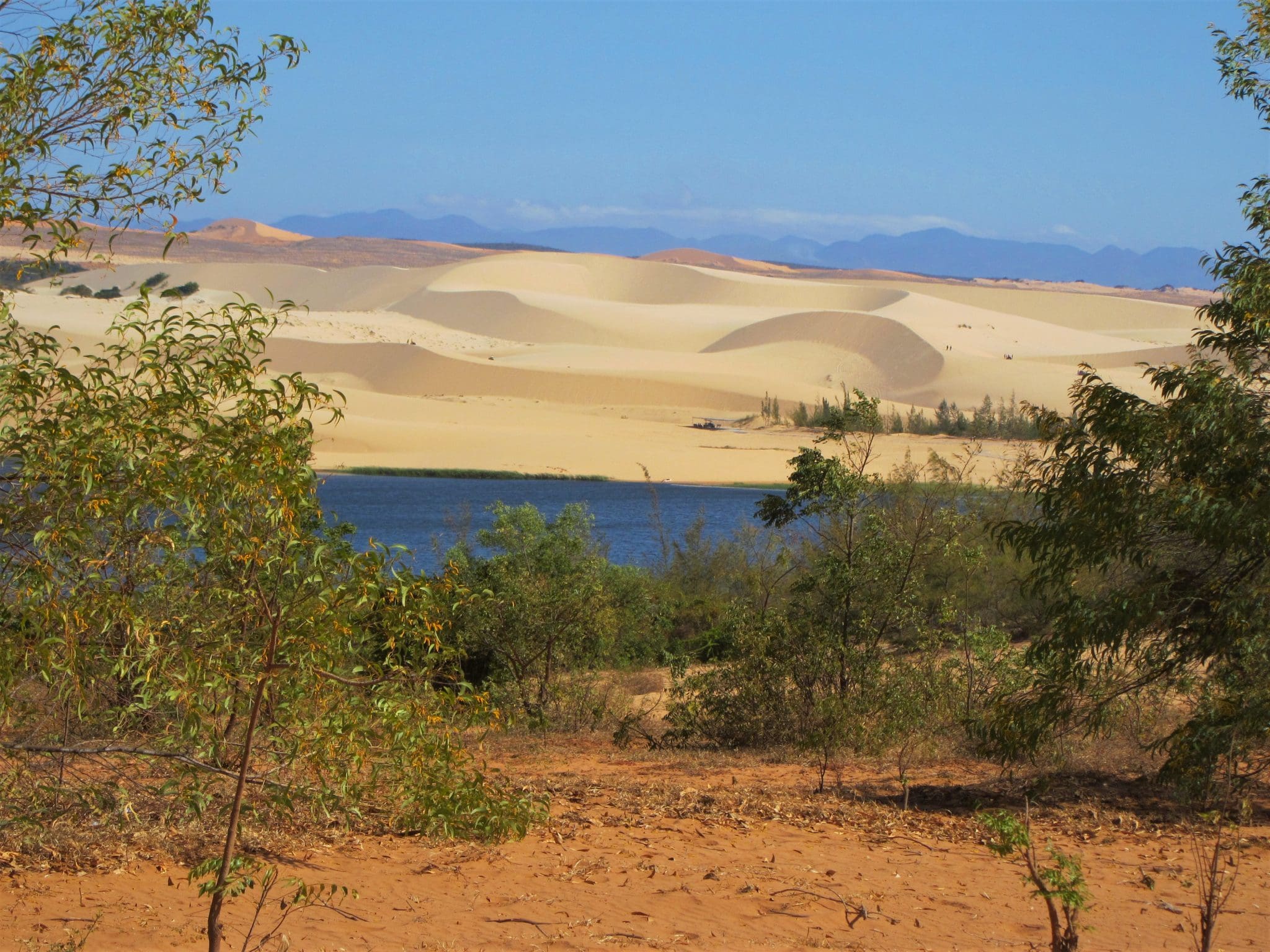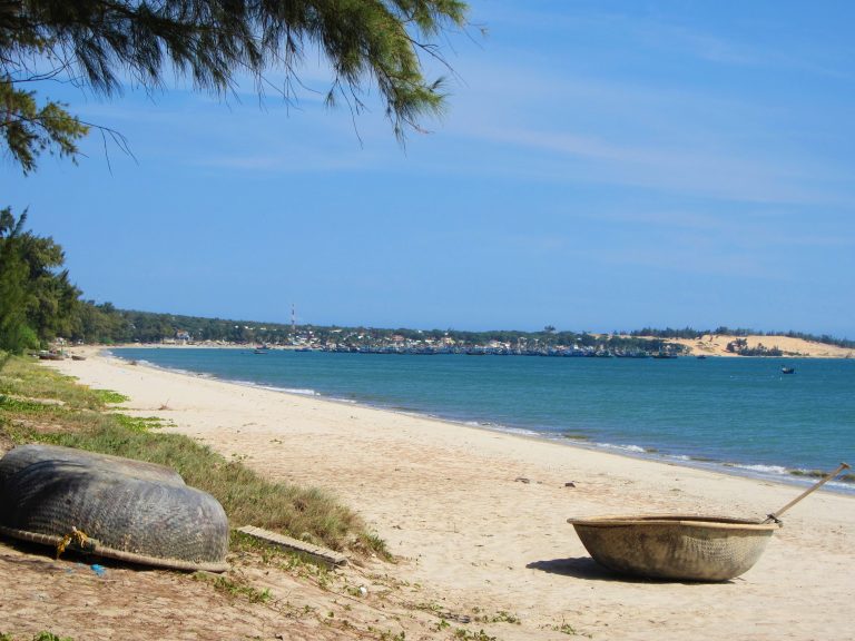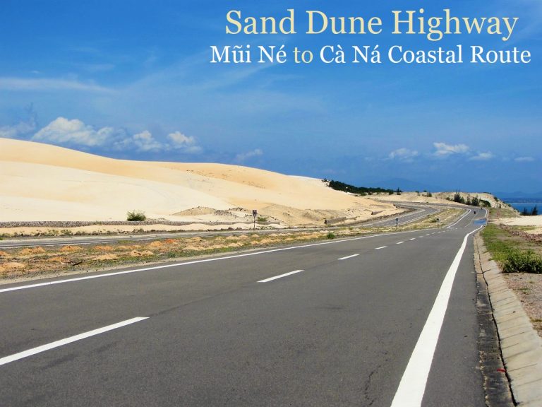Due northeast of the popular beach retreat of Mũi Né, the landscape turns arid and wide along the coast. Drifts of red and white sand form huge dunes rising just inland from the sea. A new, empty highway crosses the dunes, plunging through the sand and across the desert-like landscape to the small fishing village of Phan Rí Cửa. Further still, there are long stretches of empty beach and deserted coast roads near Liên Hương, and boulder-strewn mountains which meet the glistening seas at Cà Ná. This route – The Sand Dune Highway between Mũi Né and Cà Ná – is relatively short, easy to follow, all on good roads with light traffic, and a great way to escape the crowds of Mũi Né for a day or two, or as part of a longer coastal road trip.