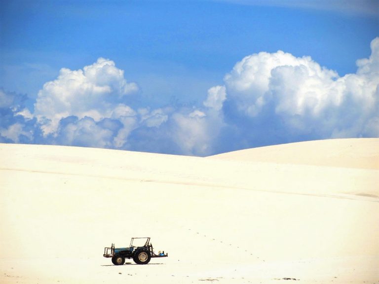 After taking either the detour or encountering the traffic cops, the two routes connect on a windswept, arid plateau covered in cassava farms, cashew trees, and studded with wind turbines near Hòa Thắng. The Sand Dune Highway starts proper after a sharp right turn due east. The road widens into four lanes and the asphalt sweeps into the distance. Just a few years ago, this road was nothing more than a red-dirt track (as seen in this video). The impressive White Sand Dunes rise behind a cobalt-blue lake. You can walk and slide on the dunes as much as you like, which is great fun, although the sand can get extremely hot during the middle of the day. It’s also possible to drive on the dunes on quad-bikes. However, I’d advise against this, because the tyre tracks are starting to ruin the aesthetic of the once smooth contours and the noise is terrible: I’m surprised it was allowed in the first place.